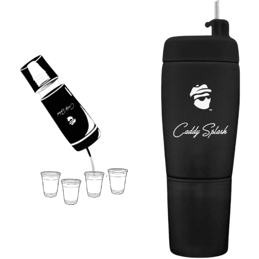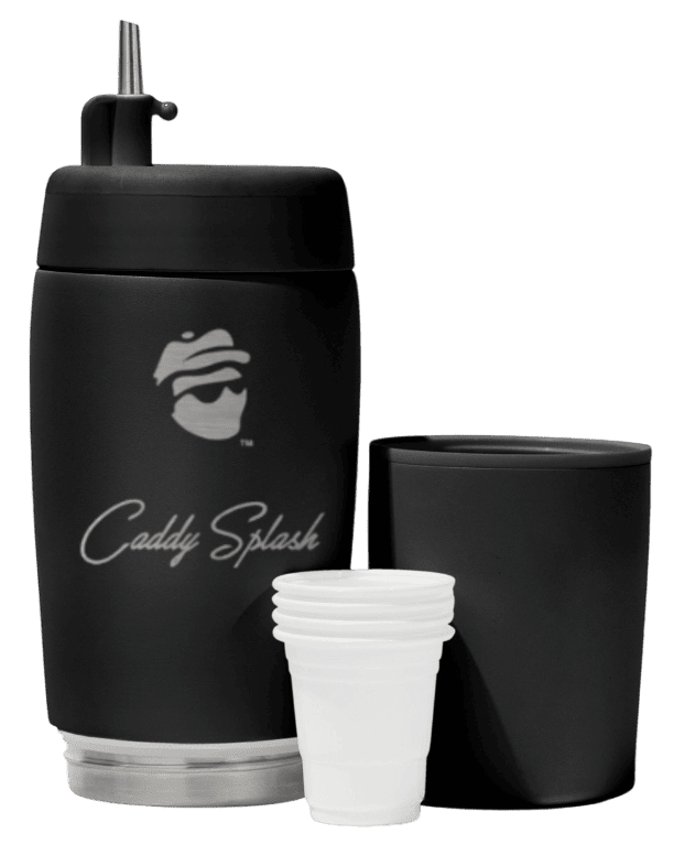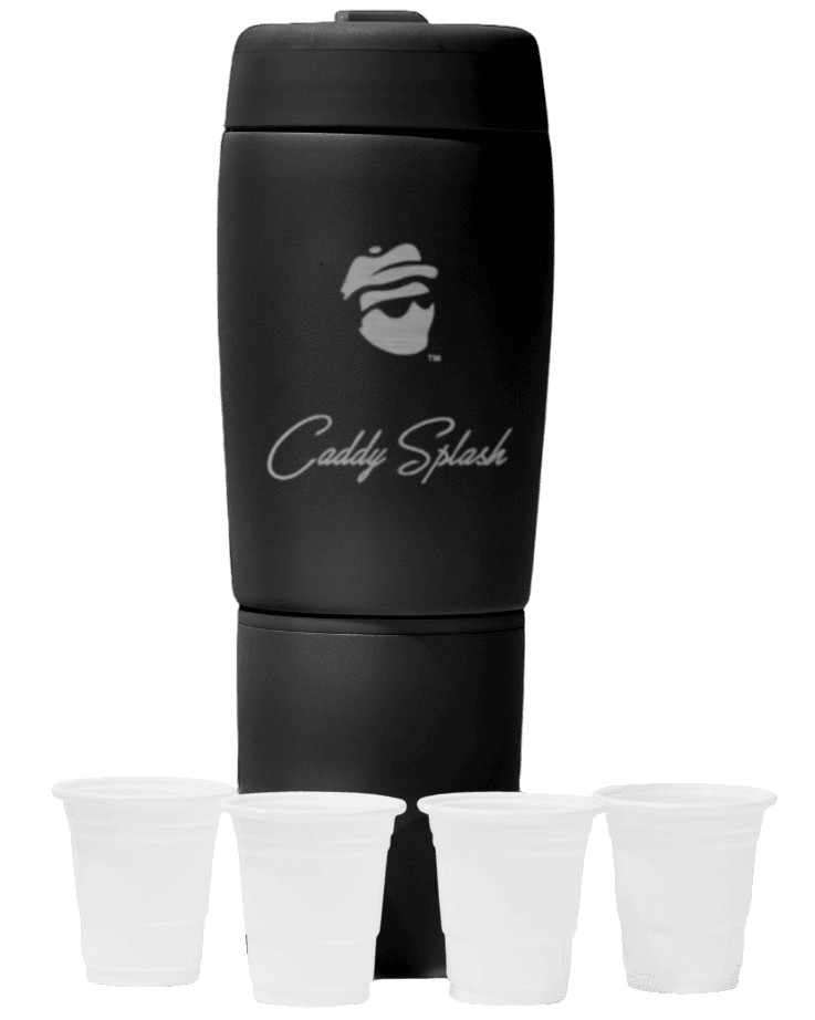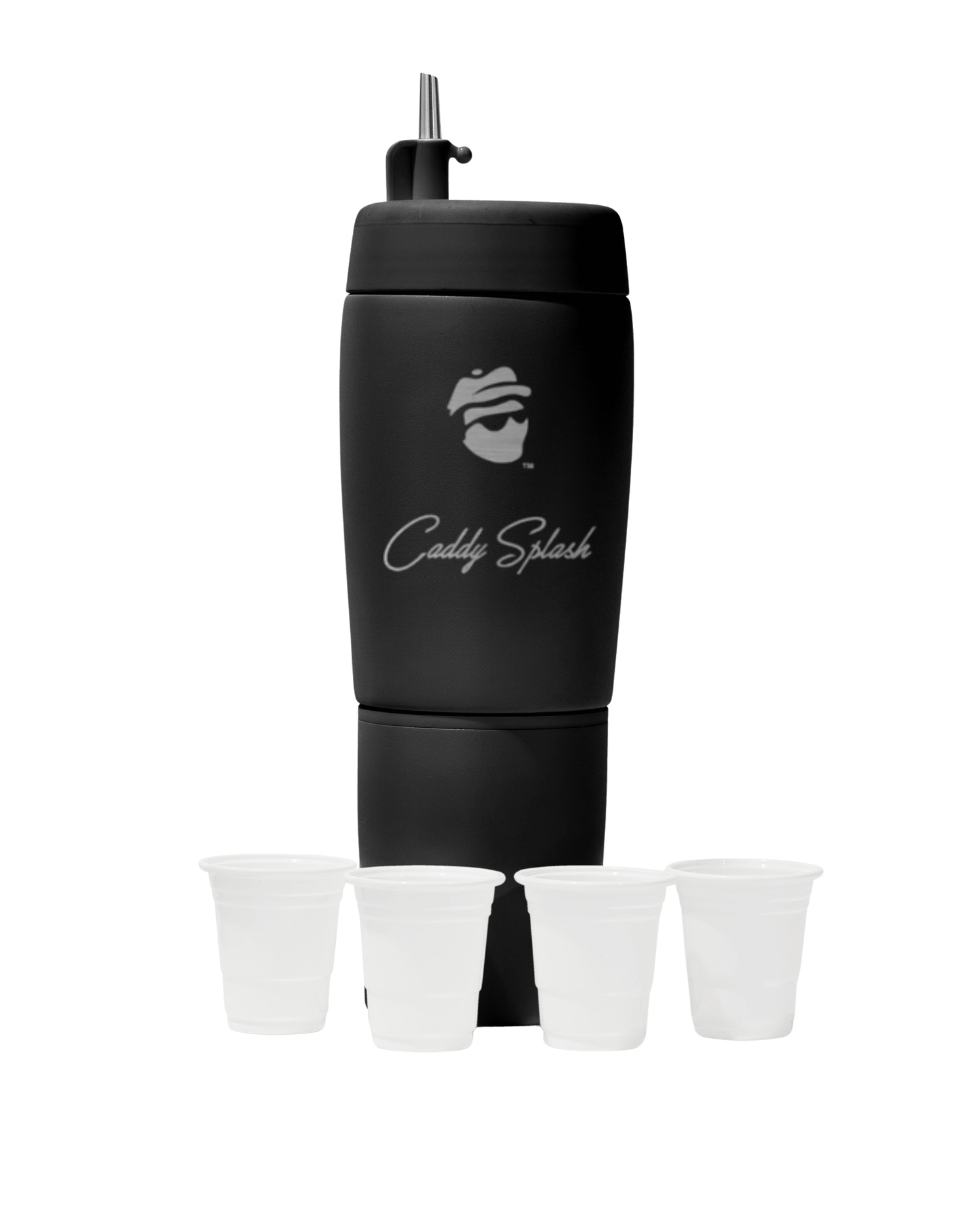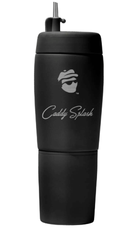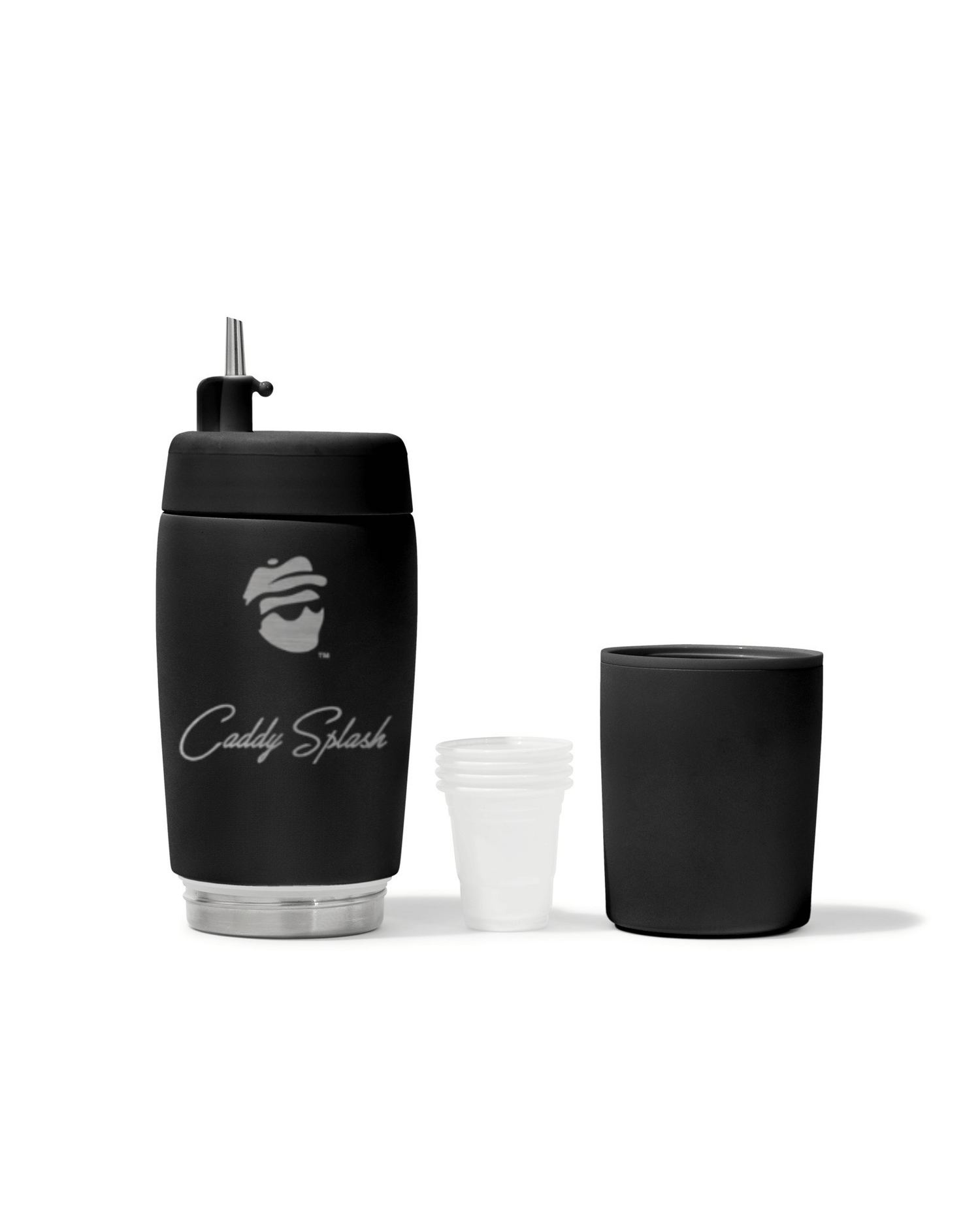 Black insulated drink container with 'Caddy Splash' branding on a white background